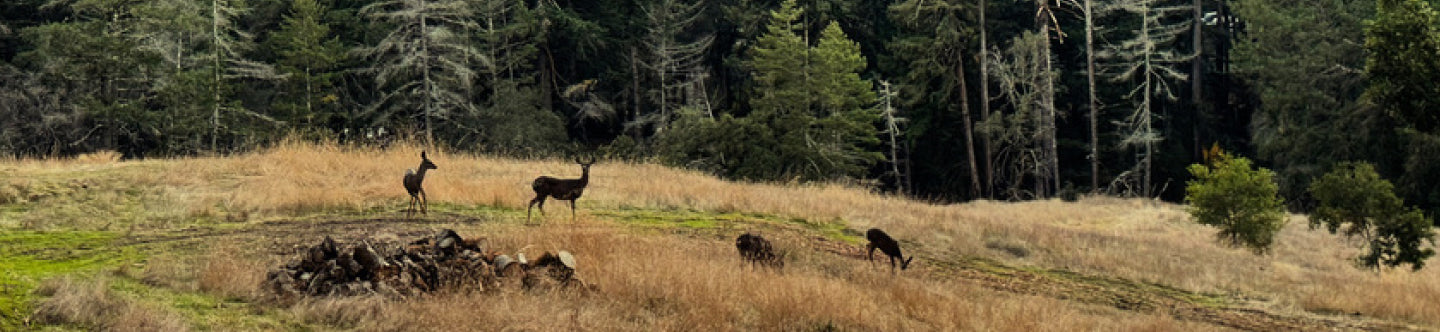 Tucked away at the top of a rustic nine-acre property in the very heart of the Santa Cruz Mountains, Breathing Trees retreat makes for a luxe glamping experience surrounded by majestic redwoods, firs, madrone, and oak trees. You'll be just steps away from the creeks and a hillside meadow with sweeping views of the Bonny Doon ridge line. While our on-grid cabins share the property with our home (where we have two friendly basset hounds, eight chickens, two ducks, and a rooster to greet your mornings), each of the sites offer plenty of privacy. You’ll have your own private fire pit, picnic table, BBQ grill, outdoor furniture, and outdoor hang areas for relaxation.